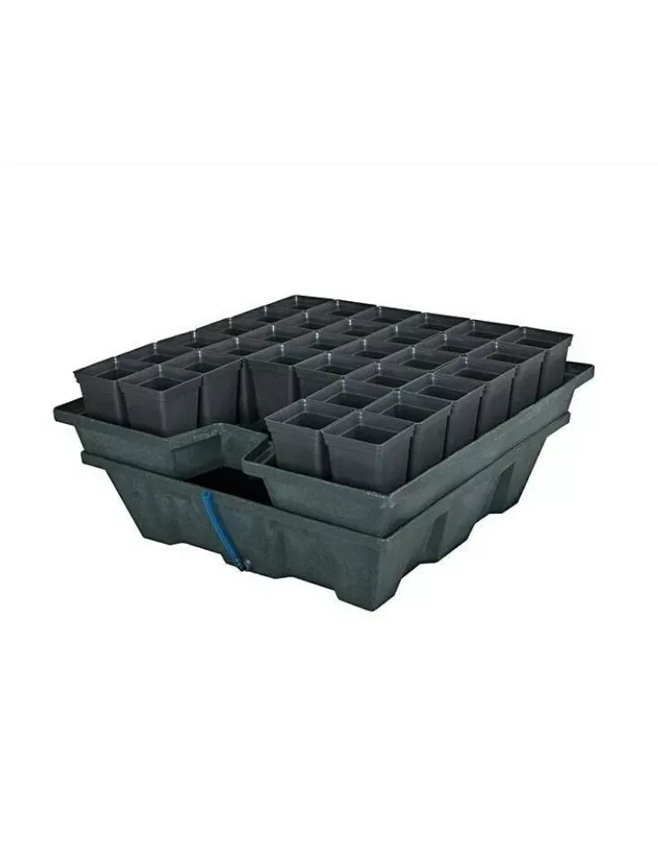 Система Ebb&Grow; представляет собой пластиковый рассадный лоток, установленный на пластиковом баке, и два трубных соединения для подачи/отведения питательного раствора.