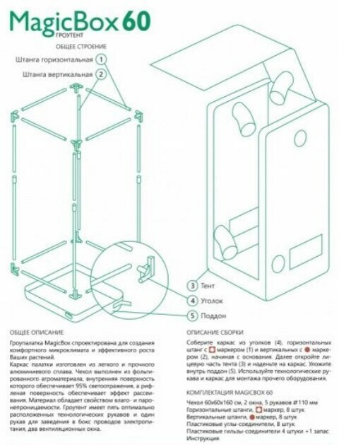 Основная информация Гроутент Magic Box 100 от MagicCloud изготовлен из фольгированного агро - материала который отражает до 95% света, а рифленая поверхность обеспечивает равномерное рассеивание. Плотный материал помогает организовать нужный микроклимат, а также обеспечивает 100% светонепроницаемость. Металлический 16-миллиметровый каркас и штанги для оборудования, прочные пластиковые соединители позволяют устанавливать тяжелое оборудование, такое как фильтры и светильники. Палатка для выращивания оборудована водонепроницаемым поддоном из той же ткани, что и покрытие.