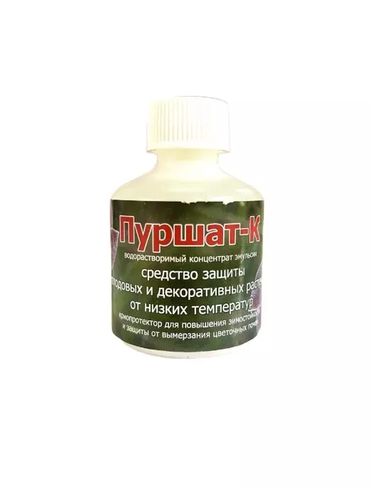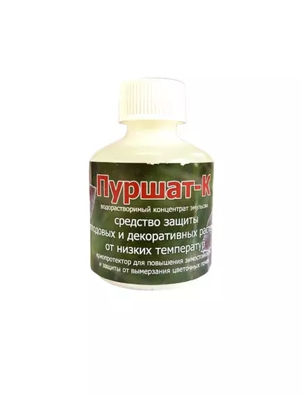 «Пуршат-К» — криопротектор для защиты плодовых и декоративных растений от критических низких температур, для повышения зимостойкости растений, препятствует вымерзанию однолетнего прироста, цветочных почек. Водорастворимый концентрат эмульсии, объем 0,5 литра для приготовления 10 литров рабочего раствора на 250-300 кв. метров площади кроны деревьев.