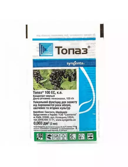Топаз - системный фунгицид с профилактическим и лечебным действием, обладает высокой эффективностью против возбудителей мучнистой росы и др болезней.