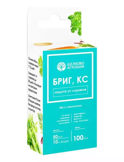Бриг - почвенный гербицид на основе действующего вещества прометрин. Гербицид применяется против злаковых и двудольных сорняков. Преимущества: • Контроль сорняков на всех фазах конкуренции с культурой, начиная с самых ранних. • Уничтожение широкого спектра однолетних сорняков, в том числе ряда проблемных видов. • Длительный защитный период. • Отсутствие последействия на последующие культуры в севообороте. • Для применения на многих культурах, возделываемых в хозяйстве. Производитель: Россия.