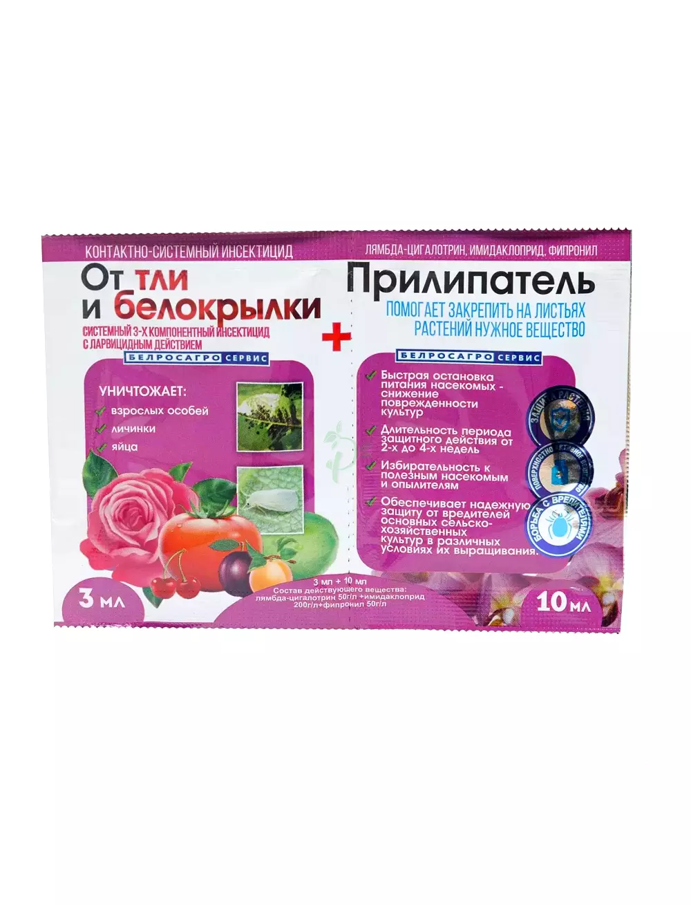От тли и белокрылки+прилипатель - контактно-системный инсектицид для уничтожения взрослых особей, личинок и яиц тли и белокрылки.