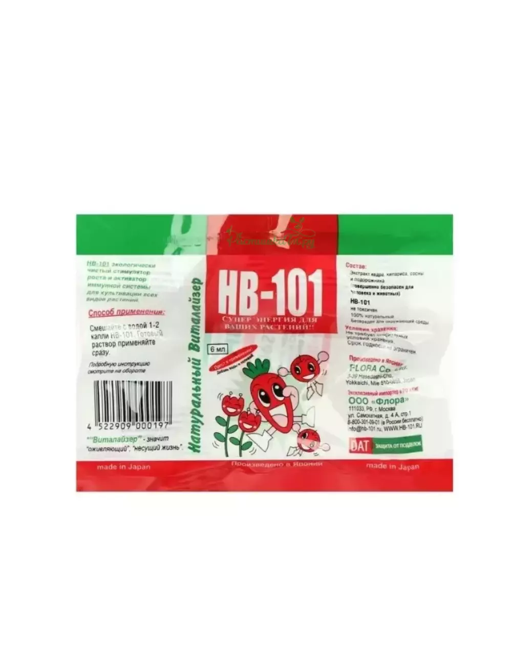 Стимулятор роста растений hb-101, ампула 6мл Флора. Улучшает всхожесть семян и увеличивает энергию роста. Укрепляет защитные функции растений, снижает степень поражения заболеваниями. Повышает устойчивость растений к неблагоприятным условиям: резким перепадам температур, морозам и весенним возвратным заморозкам, жаре и засухе, переувлажнению почвы, сильным ветрам. Защищает растения от воздействия туманов и кислотных осадков.Значительно увеличивает урожайность. Цвет и форма листьев, цветов и плодов улучшается, повышается их питательная ценность и вкусовые качества. Возможен более ранний сбор урожая.Сохранность урожая значительно увеличивается по сравнению с продукцией, при выращивании которой препарат не использовался.