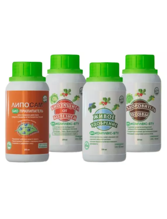 Набор Экодачника из 4 удобрений - это 4 биопрепарата для выращивания экологически чистых овощей и фруктов на своем участке. В него входят: Биозащита от болезней, Живое удобрение, Оздоровитель почвы и биоприлипатель Липосам, которые помогут Вам исключить применение химии в саду и на огороде. Препараты полностью безопасны для людей, домашних животных и окружающей среды. Продукция, выращенная с их помощью, считается экологически чистой. В составе Биокомплексов-БТУ входит специальный комплекс полезных бактерий для решения разных задач: биозащиты от грибных и бактериальных болезней (Биозащита от болезней), восстановление плодородия (Оздоровитель почвы) и сбалансированного питания (Живое удобрение), усиление и закрепление средств защиты на растениях(Липосам). Применять можно от обработки семян и до сбора экологически чистого урожая овощных и плодово-ягодных культур. Действовать согласно инструкции на этикетке.
