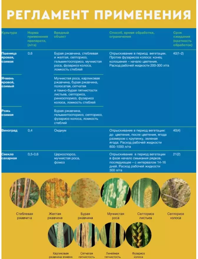 Препарат эффективен против множества грибковых болезней, таких как: ржавчинные грибы, мучнистая роса, ринхоспориоз, септориоз, гельминтоспориоз, фузариозы, ломкость стеблей, сетчатая пятнистость, тёмно-бурая пятнистость, оидиум, церкоспороз, фомоз, оидиум.