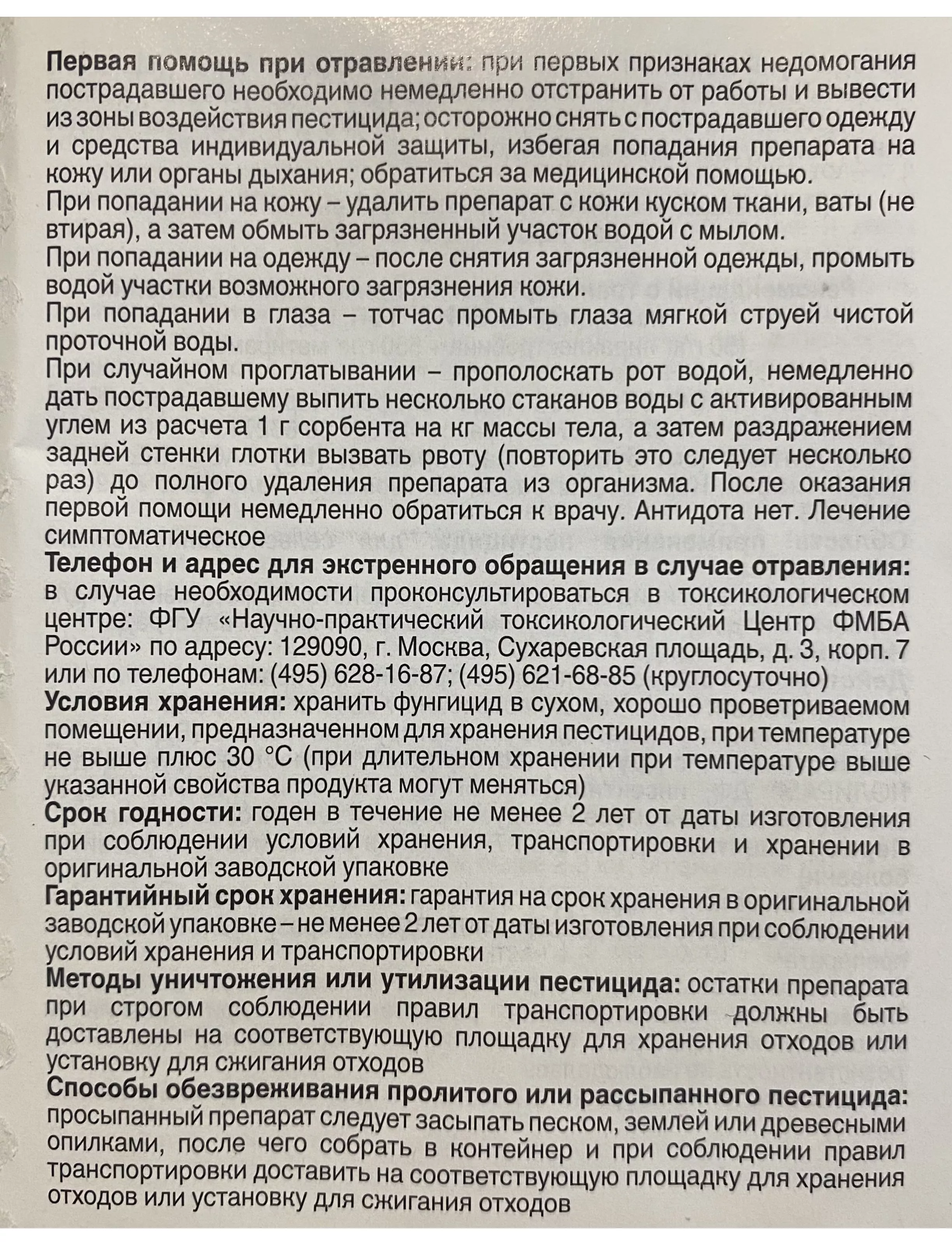 Использую для обработки винограда перед цветением. Отличный препарат - работает против основных болезней (милдью, оидиум, серая гниль) и до следующей обработки можно спать совершенно спокойно, работает очень хорошо. Бывало затягивал со следующей обработкой - проблем никаких, болезни не проявлялись. Очень надежный препарат.