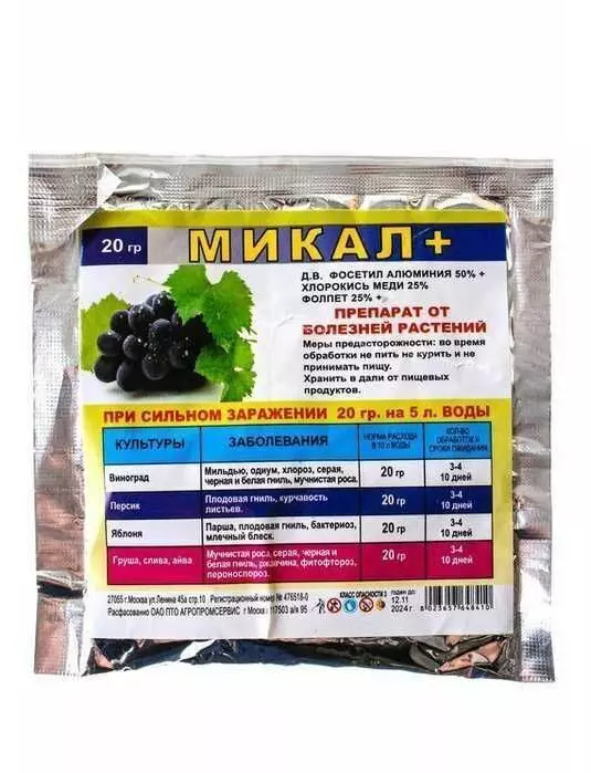 Препарат для защиты винограда, персика, яблони, груши, сливы, айвы от болезней: мильдью, одиума, хлороза, гнилей, мучнистой росы, курчавости листьев, парши, бактериоза, млечного блеска, ржавчины, фитофтороза, перноспороза.