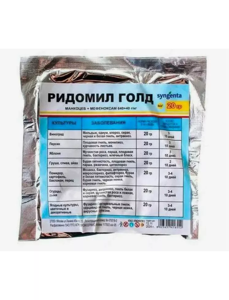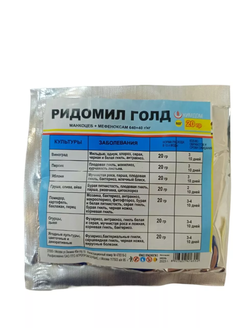 Препарат эффективен против Милдью (ложная мучнистая росы винограда), это грозное заболевание может уничтожить весь урожай винограда буквально за несколько дней и характеризуется следующими признаками: как и у огурцов, листья лоз сначала покрываются маслянистым желтым налетом сверху и грибницей снизу, а затем подсыхают и опадают. Кожица пораженных ягод винограда сморщивается.