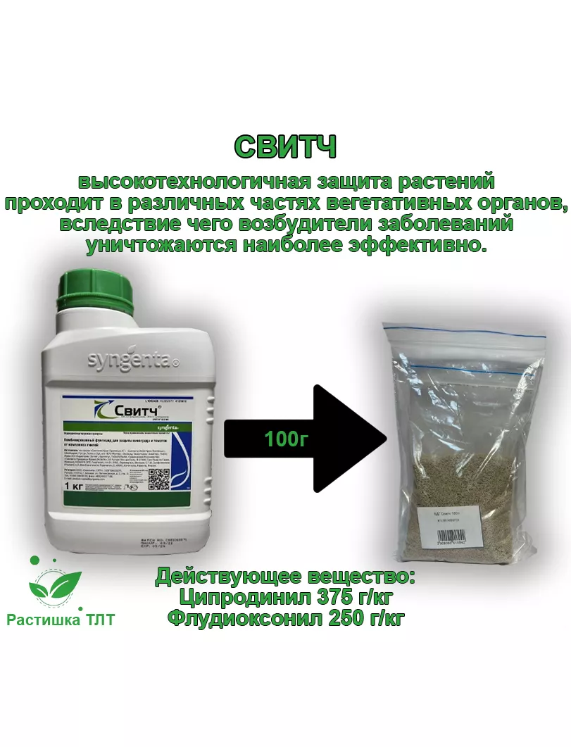Свитч - высокоэффективное средство против серой гнили на овощах, ягодах, фруктовых деревьев и цветов. Препарат воздействует на четыре стадии развития патогена, защищая его от проникновения.