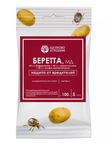 Беретта - высокоэффективный трехкомпонентный препарат в масляной формуляции для контроля особо вредоносных насекомых–вредителей на картофеле. Благодаря масляной формуляции улучшаются липофильные свойства д.в. Препарат отлично закрепляется на теле насекомого, усиливая контактное действие. Лучше удерживается на листьях растений и равномерно распределяется по поверхности, в полной мере проявляя трансламинарное действие и дольше сохраняя защитные свойства.