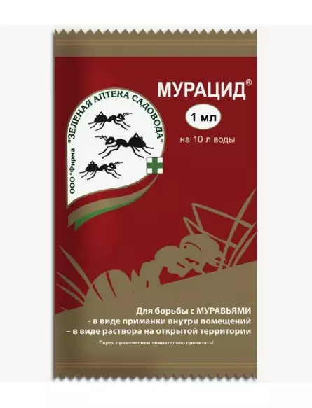 Средство для борьбы с муравьями Мурацид 1мл от "Зеленой Аптеки Садовода" - это эффективное и безопасное решение для уничтожения садовых муравьев на овощных, цветочных культурах, землянике, картофеле, в защищенном грунте, вокруг плодовых деревьев и кустарников, около строений и домовых муравьев на террасах, верандах. Препарат безопасен для растений и почвенных микроорганизмов, относится к 3 классу умеренно опасных веществ.