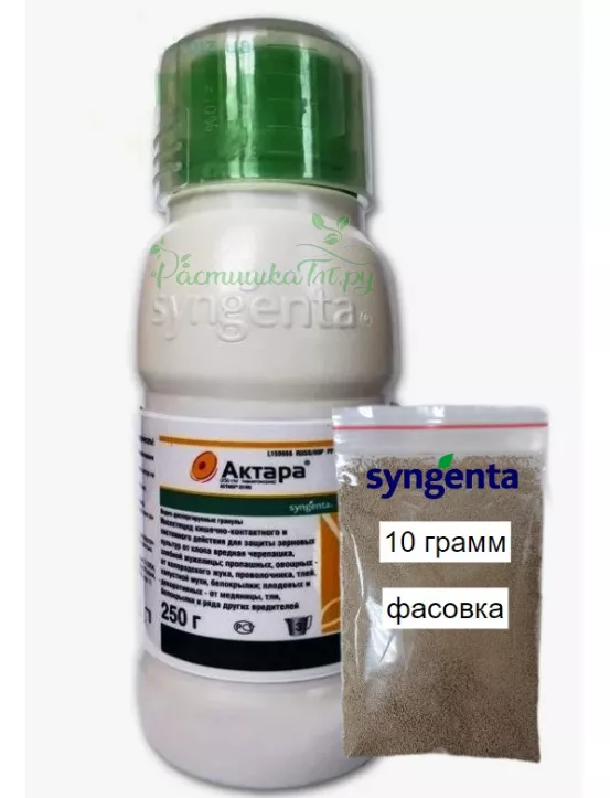 Актара - системный инсектицид кишечно-контактного действия для контроля комплекса сосущих и листогрызущих вредителей. Инсектицид применяют как для опрыскивания растений в период вегетации, так и для внесения в почву. Применяется двумя способами: опрыскиванием и внесением под корень с поливной водой. При почвенном применении за счет системного действия инсектицид одновременно защищает от почвенных и наземных вредителей: сосущих, скрытноживущих и листогрызущих.
