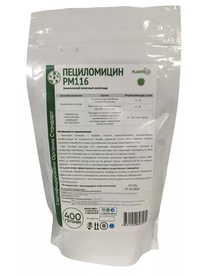 Пециломицин РМ116 - сухой биологический инсектицид для борьбы с почвенными вредителями: медведкой, проволочником, личинками совок, личинками майского жука и зимующими формами колорадского жука, при выращивании овощных, плодово-ягодных, сельскохозяйственных и декоративных культур.