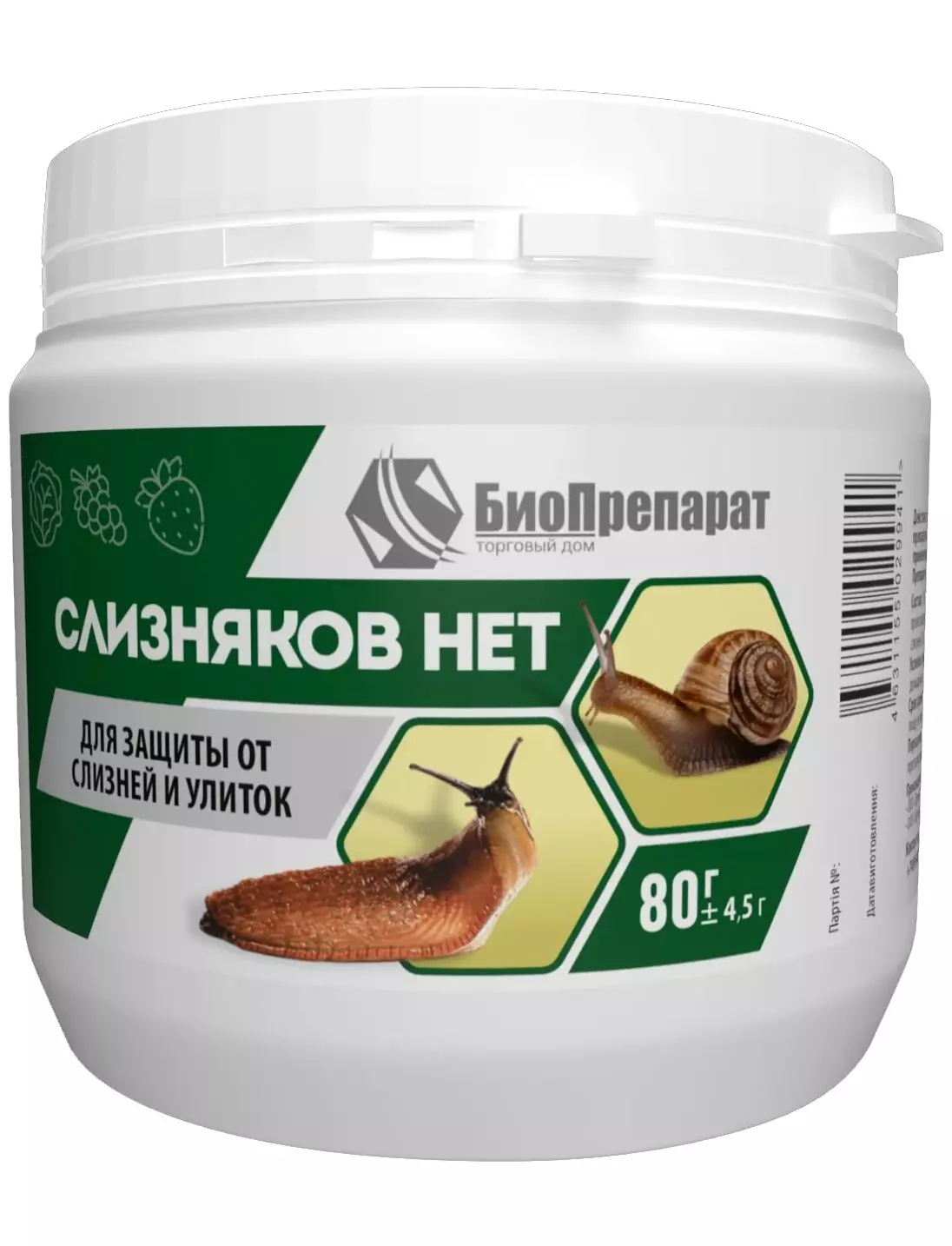 Слизняков НЕТ – гранулированный биологический молюскоцидный препарат-приманка желудочно-контактного действия для борьбы с улитками и слизнями. Для использования на приусадебных участках, спортивных зонах, в производственных, санитарно-бытовых, хозяйственных постройках (помещениях) и других объектах, в местах массового отдыха, в подвалах, подсобных помещениях и в местах расположения пожарных емкостей и мусорных контейнеров, во всех местах развития и размножения моллюсков. Препарат широко применяется для защиты овощных и плодово-ягодных культур от различных видов слизней и улиток. Действие препарата проявляется вскоре после поедания гранул слизнями и контакта поверхности тела моллюсков с препаратом, впоследствии вызывает их гибель.