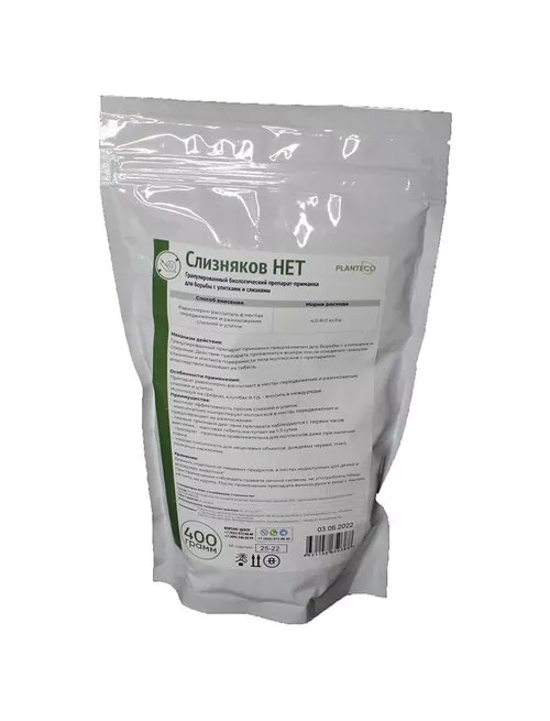 Слизняков НЕТ – гранулированный биологический молюскоцидный препарат-приманка желудочно-контактного действия для борьбы с улитками и слизнями. Для использования на приусадебных участках, спортивных зонах, в производственных, санитарно-бытовых, хозяйственных постройках (помещениях) и других объектах, в местах массового отдыха, в подвалах, подсобных помещениях и в местах расположения пожарных емкостей и мусорных контейнеров, во всех местах развития и размножения моллюсков. Препарат широко применяется для защиты овощных и плодово-ягодных культур от различных видов слизней и улиток. Действие препарата проявляется вскоре после поедания гранул слизнями и контакта поверхности тела моллюсков с препаратом, впоследствии вызывает их гибель.