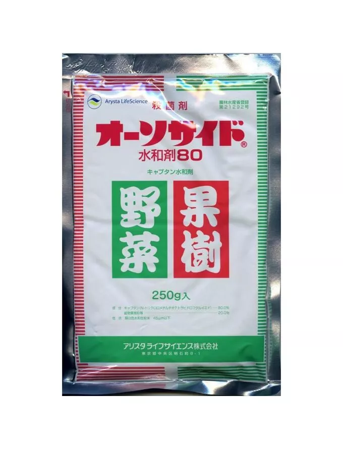 Это комплексное дезинфицирующее средство, широко используемое в мире в течение длительного времени. В Японии используется в течение 60 лет. Обладает стабильным профилактическим действием при широком спектре заболеваний для многих культур, в том числе цветов, овощей и фруктовых деревьев. Использование: опрыскивание в вегетационный период, дезинфекция семян и орошение почвы на стадии рассады позволяют предотвратить гниль и поражение рассады. Корни растений обрабатываются каптаном для предотвращения гниения. Каптан обладает высокой фунгицидной и слабой бактерицидной активностью. Риск развития лекарственной устойчивости низок. Эффективен против устойчивых бактерий. Эффективен против: различных гнилей - гниль корневой шейки, корневая гниль, стеблевая гниль (фузариоз, эрвиния, ризоктония, питиум), черная пятнистость, бурая пятнистость, кольцевая пятнистость, мучнистая роса, ложная мучнистая роса, фитофтора, антракноз, ботритис серый (серая плесень), парша. Использовать методом опрыскивания 1 гр на 0,4 - 1,2 л воды до 8 раз. Возможно использовать для протравливания семян, клубней, для замачивания и порошкового покрытия. Состав: Captan 80% Свойства: растворимый порошок