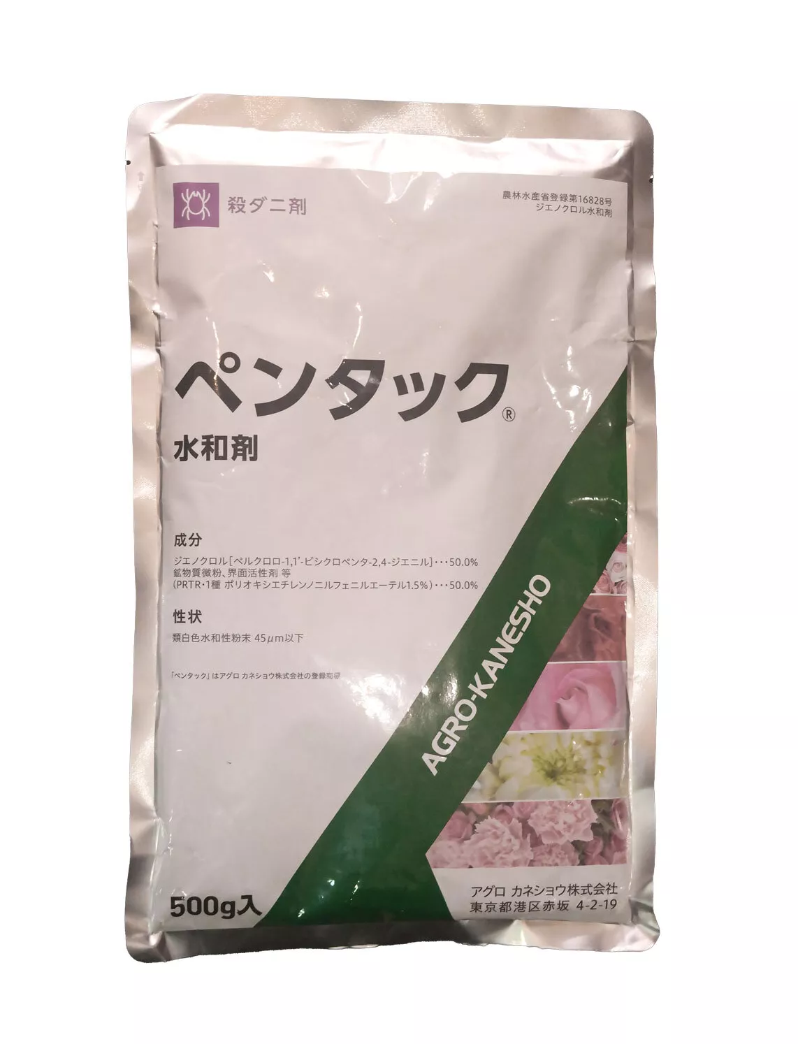 Действующее вещество: Диенохлор [перхлор-1,1'- бициклопента-2,4-диенил] 50,0% Форма продукта: смачивающийся порошок Способ обработки: полив/опрыскивание Особенность продукта: Поскольку его действие отличается от действия обычных препаратов, оно эффективно против паутинных клещей, устойчивых к другим препаратам. Он медленно действует, но очень эффективен против взрослых личинок паутинного клеща, подавляя появление в течение длительного периода времени. Пентак — Акарицид для борьбы с паутинным клещом цветов особенно роз и лиственных растений, выращиваемых в помещениях. Рекомендован для растений, особенно подверженных нападениям клеща. Так как он имеет наиболее продолжительный период действия и защищает от вспышек популяции клеща на наиболее длительное время. Он особенно эффективен против паутинного клеща при опрыскивании роз, гвоздик и цветов при выращивании в закрытых помещениях. Расход: 1 гр на 1 л Класс опасности: 3й класс опасности (умеренно действующее вещество).