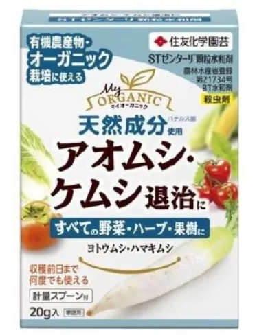 Может использоваться для овощей, фруктовых деревьев, картофеля и бобовых за 1 день до сбора урожая. В нем используются натуральные ингредиенты, он оказывает незначительное воздействие на окружающую среду и может использоваться в соответствии со стандартами органического JAS (органическое выращивание). Активные ингредиенты, вырабатываемые микроорганизмами в естественной среде, эффективны против вредителей чешуекрылых, таких как тля, совка и листоед. В частности, он очень эффективен против совок, против которых обычные средства БТ оказались неэффективны, и ромбовидных мотыльков, устойчивых к другим инсектицидам. В виде смачиваемого порошка он легко растворяется в воде, с ним легко обращаться, не образуя пыли. После опрыскивания требуется время для истребления вредителей, но повреждение подкормки сразу прекращается, что помогает предотвратить повреждение. Эффект длится от 1 до 2 недель (без дождя). Меры предосторожности: Избегайте смешивания с пестицидами, такими как известково-серные смеси, бордосская жидкость и удобрения для листвы с сильной щелочностью. Строго соблюдайте предписанную концентрацию разведения, так как это может вызвать фитотоксичность . При использовании для гвоздик восковой слой листьев может выщелачиваться из-за прилипания химикатов, поэтому избегайте опрыскивания непосредственно перед сбором урожая. Состав: Живые споры Bacillus thuringiensis и продуцируемый кристаллический токсин Свойства: растворимый порошок 20 гр